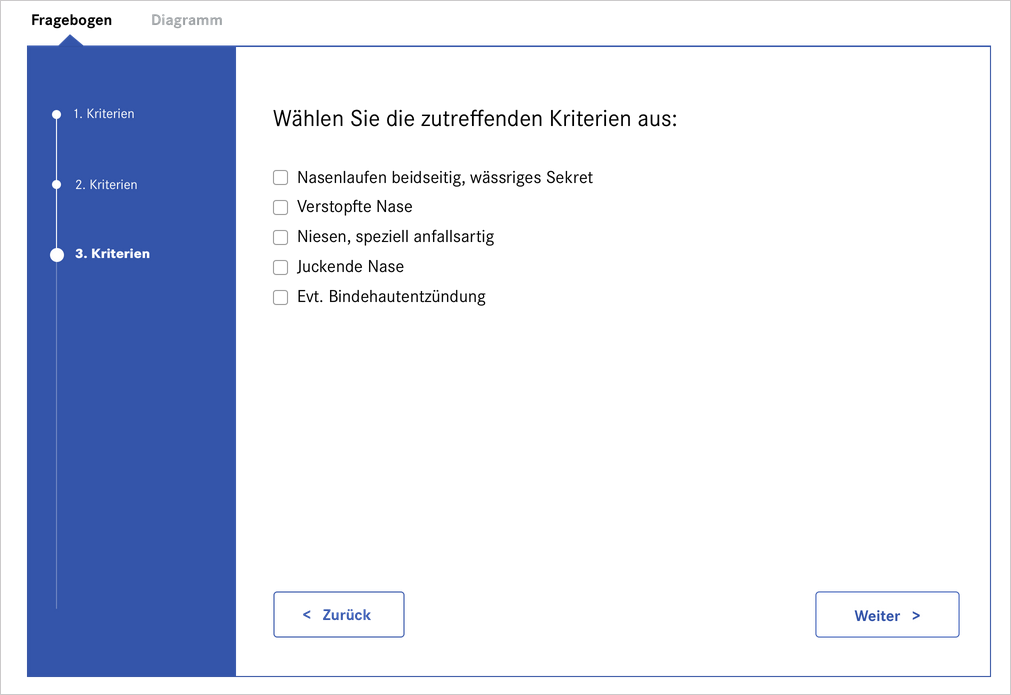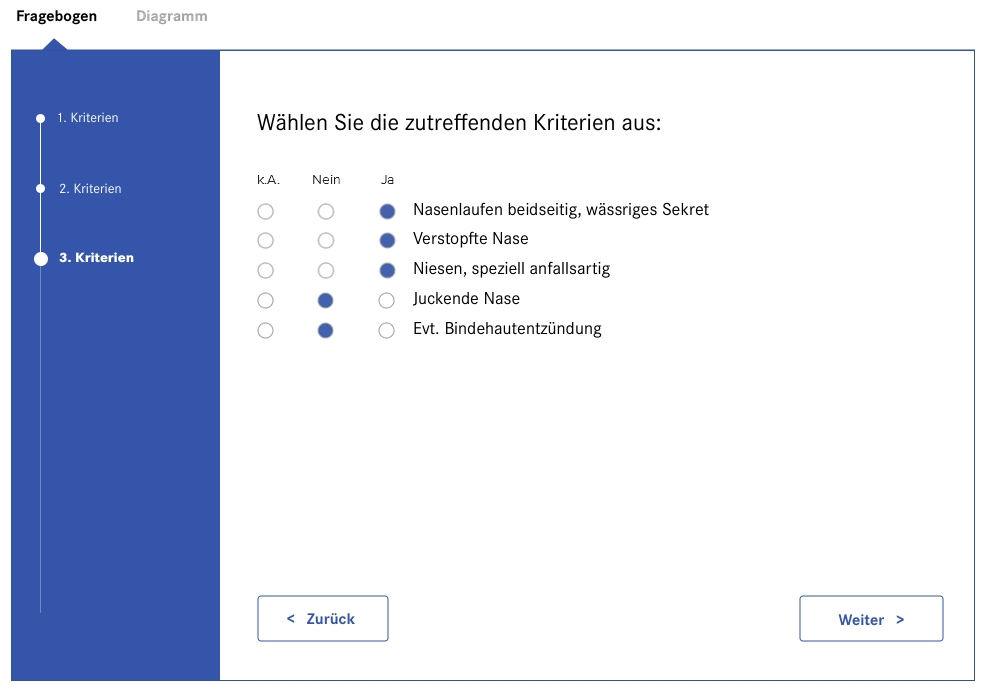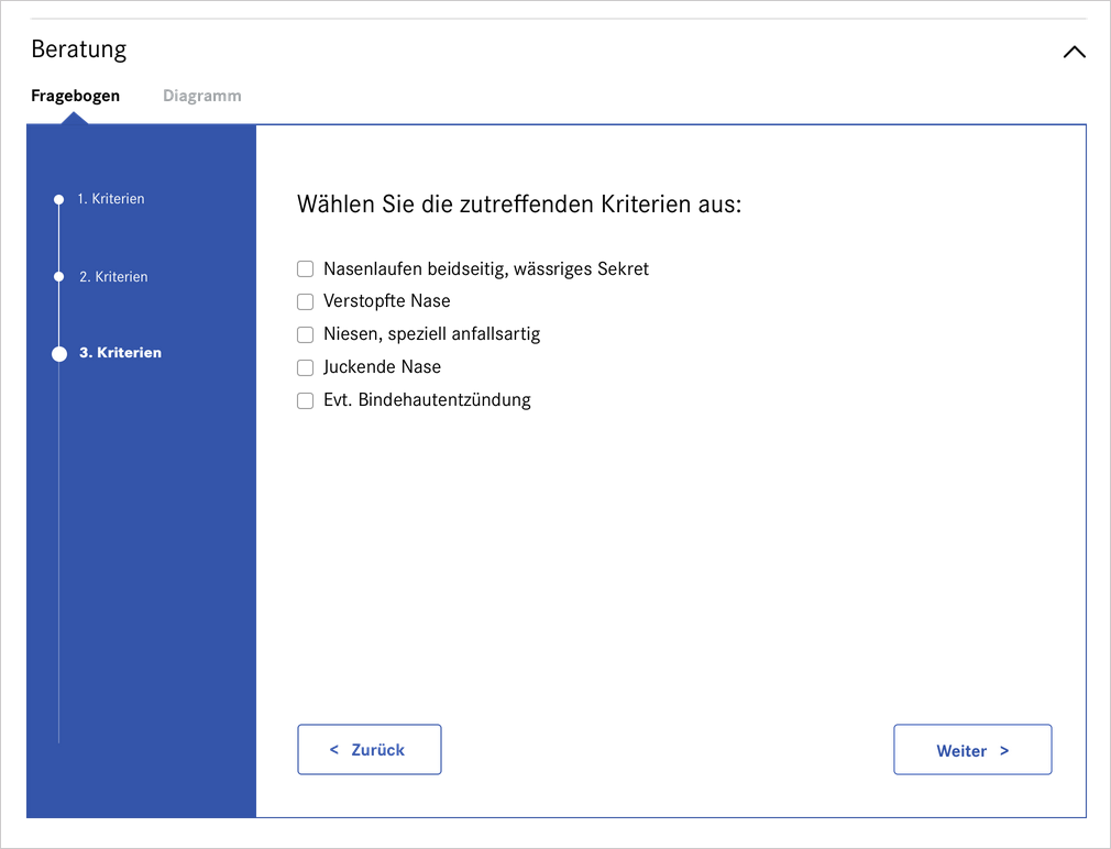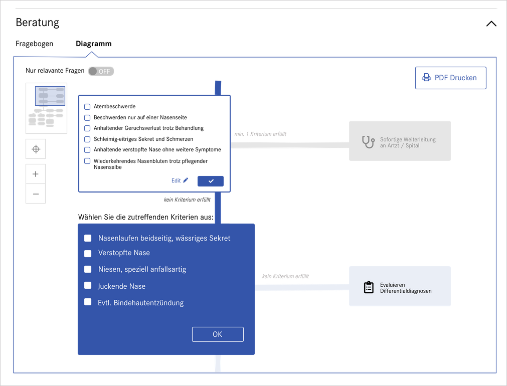 Im Rahmen einer Expertenevaluation untersuchten wir den als Lösungsvorschlag vorliegenden Prototypen auf dessen Gebrauchstauglichkeit. Nebst einem eher klassischen textuellen Beratungsfragebogen gehörte dazu auch ein grafisches Beratungsdiagramm, welches alternativ oder als Unterstützung die Beantwortung der einzelnen Fragen erleichtern soll.