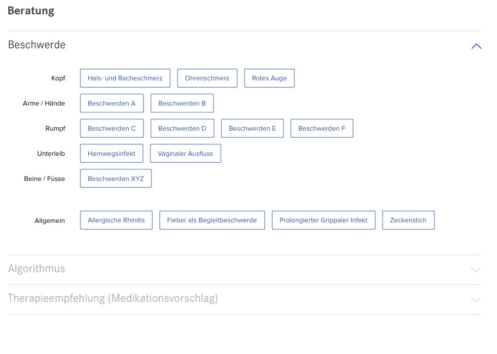 Als Resultat der Beratung wird dem Benutzer eine Empfehlung angezeigt. Dies kann entweder eine Weiterleitung an einen Arzt oder eine Weiterbehandlung durch den Apotheker sein. Kann die Behandlung durch den Apotheker durchgeführt werden, wird zudem eine Medikationsauswahl angezeigt.