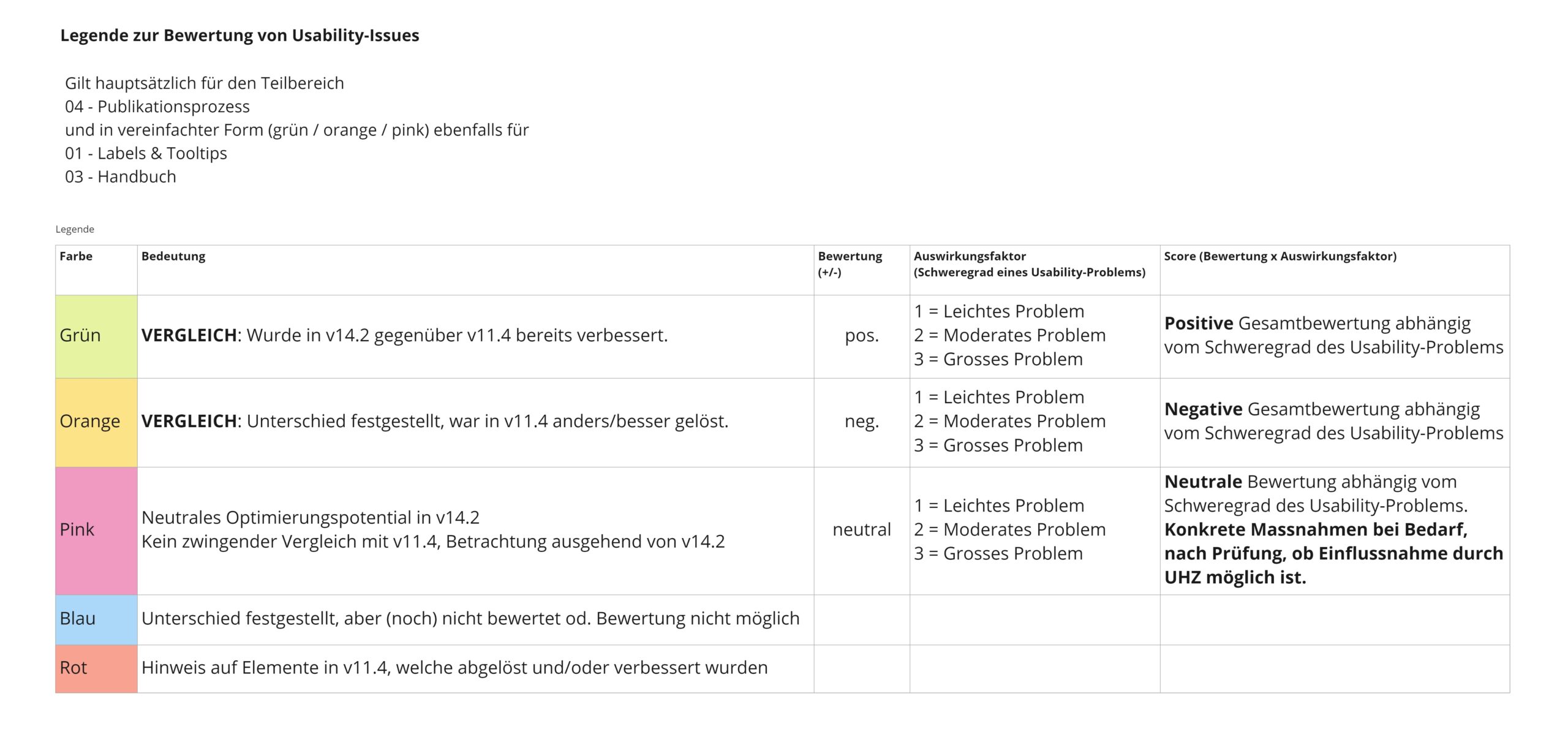 - Um für die einzelnen zu untersuchenden Teilbereiche des Systems eine Bewertung in Form einer Schulnote abgeben zu können, erstellten wir eine Bewertungsskala für die gefundenen Usability-Probleme. Dieses Schema erlaubte es uns, zwischen dem direkten Vergleich von Versionen und weiterem, unabhängigem Optimierungspotential zu unterscheiden.
