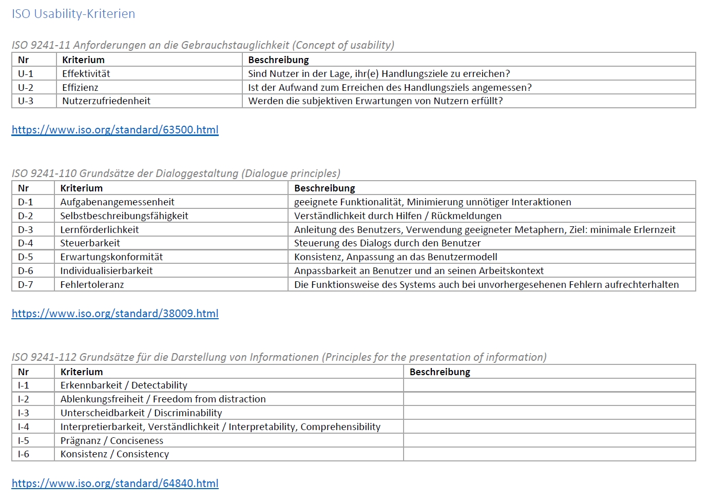 - Da wir im Team eine Expertenevaluation der von der UZH genannten Teilbereiche vornehmen würden, einigten wir uns als Erstes auf gemeinsame Usability-Kriterien zur Beurteilung (Heuristiken).